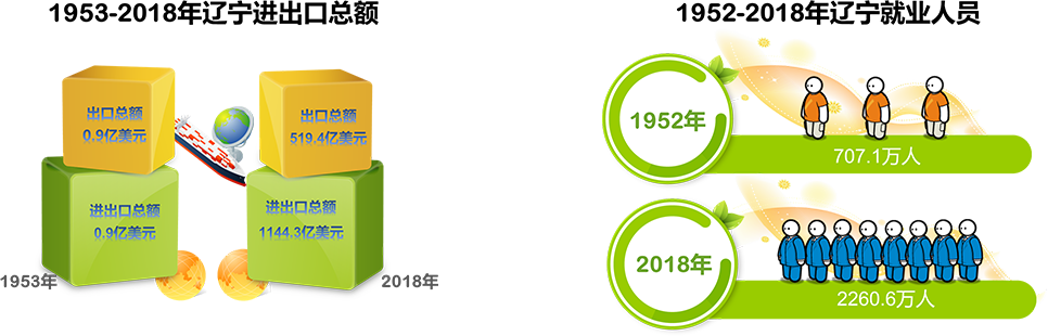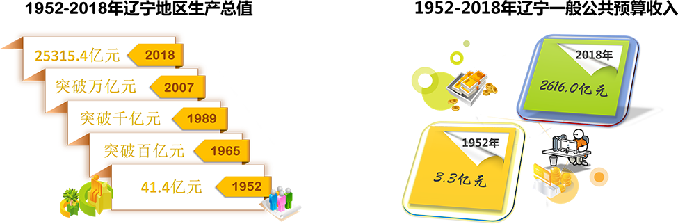 建国初期,辽宁在百废待兴中艰难起步,全省地区生产总值由1952年的41.4亿元增加到2018年的25315.4亿元,按可比价格计算,是1952年的213.5倍。