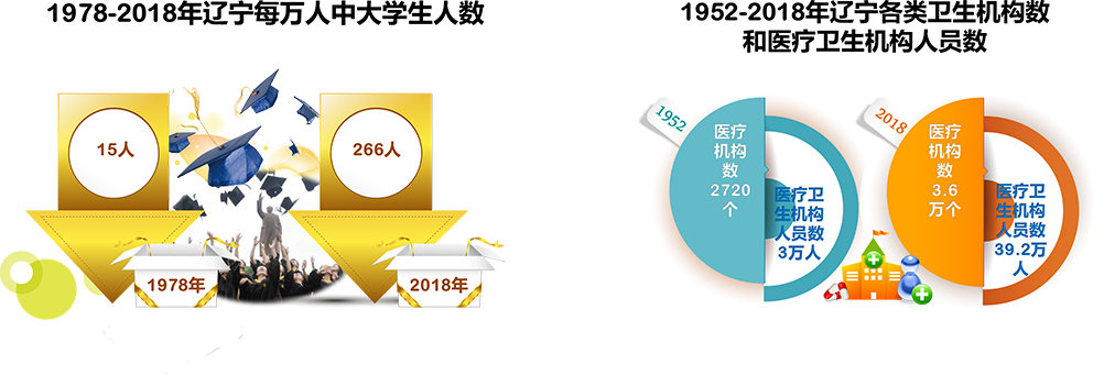 70年来,辽宁各项社会事业取得长足进步。建国初期,辽宁迅速恢复生产,作为全国重点建设省份,大批专家和技术人员被调往辽宁工作,支持辽宁的发展建设,科技、教育基础相对较好,文化事业在曲折中不断前行,公共卫生体系刚刚建立,体育事业发展空间较大。经过70年的发展变化,特别是改革开放以来,辽宁社会事业从发展不均衡到科技、教育、文化、卫生、体育等各领域硕果累累、全面繁荣,社会与经济发展协调性不断增强,人民群众的获得感、幸福感和满意度不断提升。